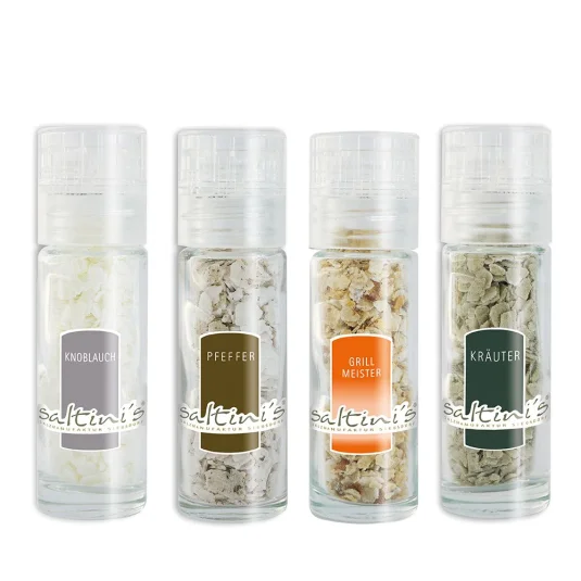 Petit moulin à épices rechargeable, avec broyeur en plastique à 2 niveaux de mouture (fin et grossier), tient dans la poche ce qui en fait un compagnon indéfectible, variétés disponibles: chili bio, romarin bio, poivre bio, herbes bio, ail bio, citronnelle bio, origan bio, mélange grillade bio, curry Jaipur, Himalaya, gourmet, sel de roche, mélange poisson bio, rose bio