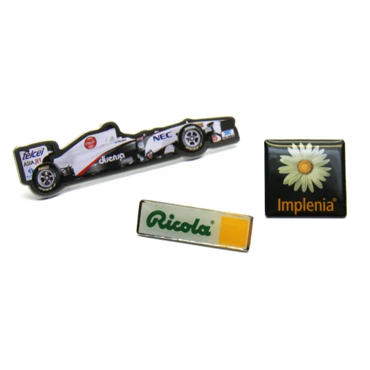 Pin's en métal, couleurs imprimées (impression offset), avec couche de résine artificielle, illustrations photoréalismes possibles, à fermeture papillon, forme et design au choix.