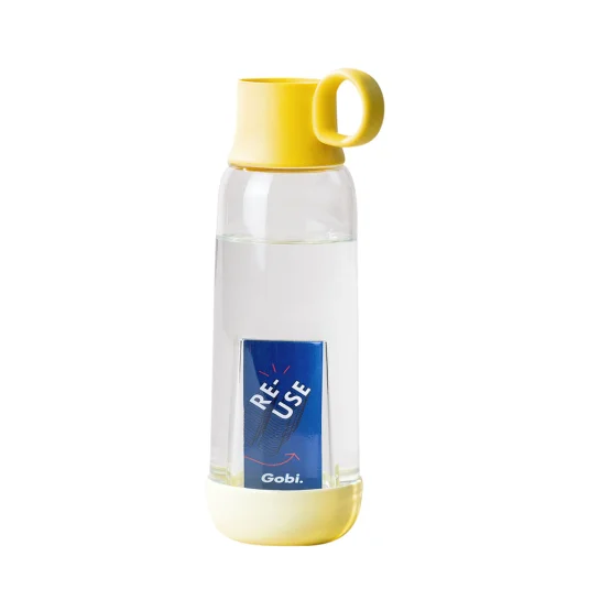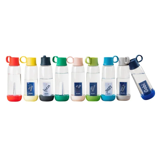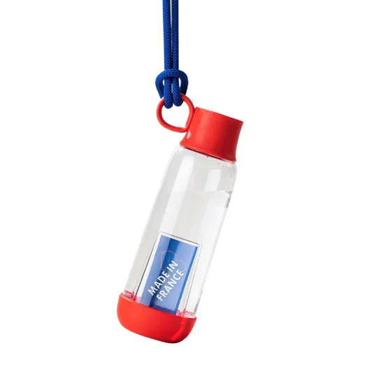 Bouteille en Tritan (sans BPA), légère, design sympa, prise ergonomique, fond antidérapant et étiquette insérable à l’intérieur pour la personnalisation.