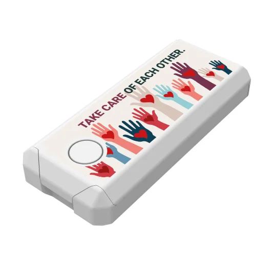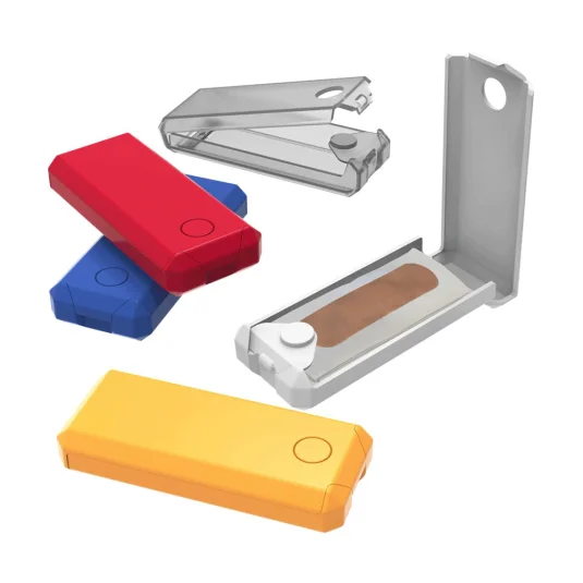 Boîte en plastique avec 5 x 2 pansements, s’ouvre avec une seule main grâce à un bouton-poussoir