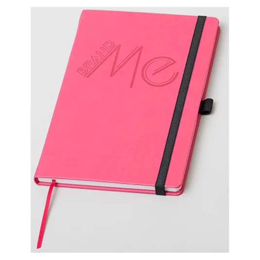 Carnet élégant avec couverture Soft Touch et bords arrondis. Comprenant 100 pages en papier certifié FSC (80g/m², lignées, quadrillées ou avec des pointillés), un marque-page satiné et un élastique pour le maintenir fermé.