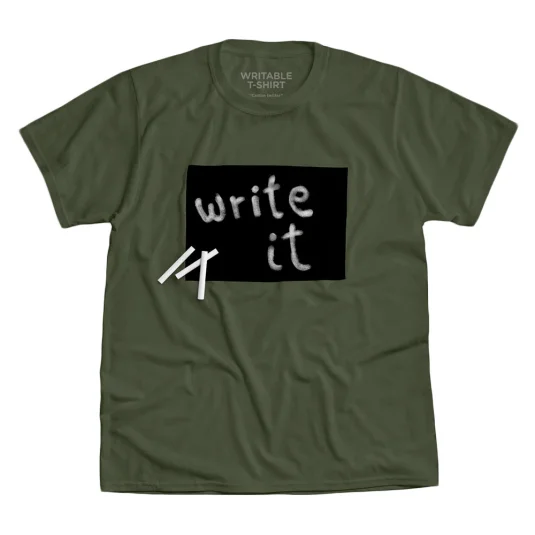 Un t-shirt avec un tableau noir destiné à y inscrire votre message à l’aide d’une craie blanche.