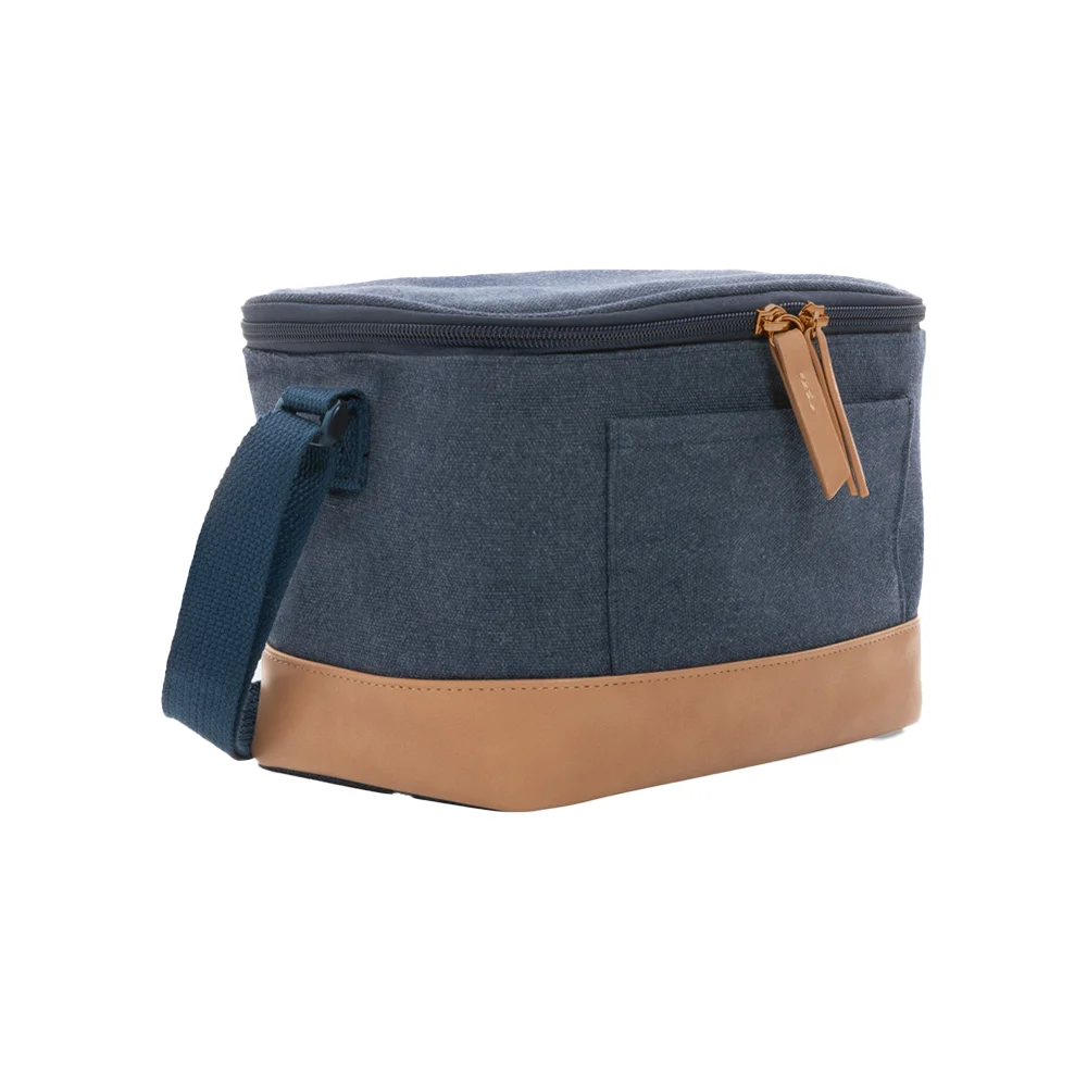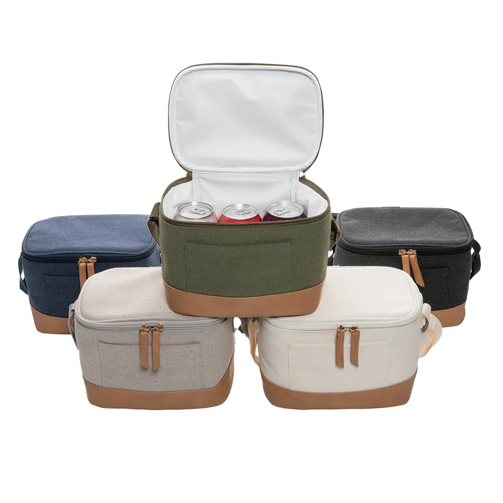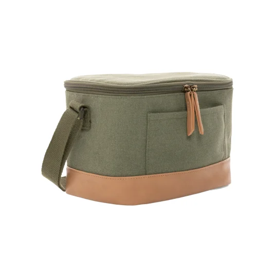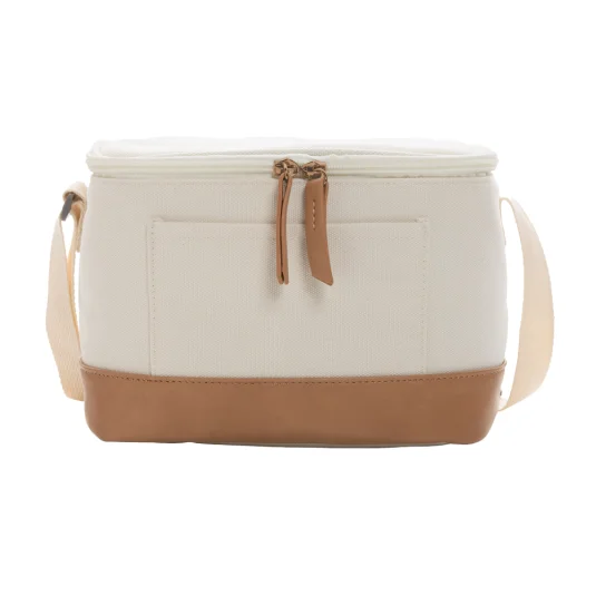 Sac isotherme fabriqué en toile recyclée de haute qualité, dispose d'une poche frontale ouverte et d'une poignée pour un transport facile.